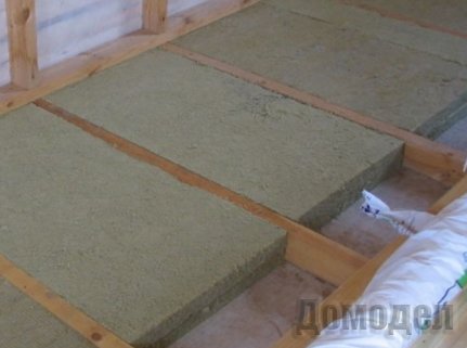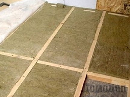 После этого готовая гидроизолированная подушка выравнивается стяжкой. Когда стяжка застынет, её покрывают красками утеплителями, и только после этого укладывается основной утеплитель. Такой монтаж утеплителя пригоден для бетонных полов.