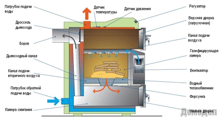 Процесс «сгорания» топлива происходит за значительно большее время, а владелец такого котла может эффективно контролировать этот процесс. Тепло, которое выделяется в процессе нагрева, не выводится через дымоход с газами.
