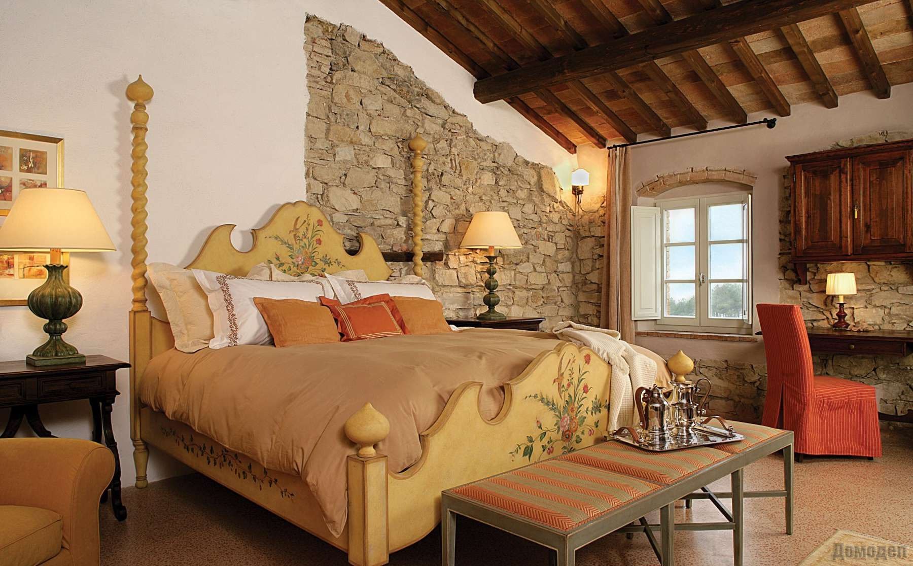 Дизайн интерьера спален выдерживается в античных мотивах, комфортных и богатых. Одним из главных элементов комнат есть большой камин, который обязательно достаёт до потолка. В тканях используются натуральные материалы и сдержанные неяркие цвета.