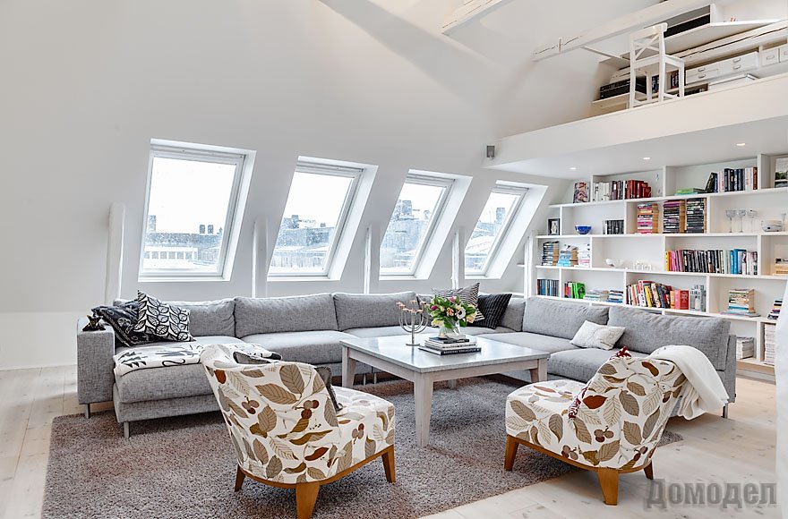 Все вместе придает комнате теплый и уютный облик. Кент скроил края плоского ламбрекена в форме восточной пагоды, довершив их позолоченными деревянными колокольчиками, наклонные линии которых вторят наклону чердачного потолка. Каждый метр пространства в комнате используется, и даже маленький уголок между балками выгорожен драпировкой, за которой образовался уютный закуток с креслом для чтения, обитым клетчатой красно-белой хлопчатобумажной тканью от «Сцаламандр», цвета которой соответствуют расцветке ткани драпировок.