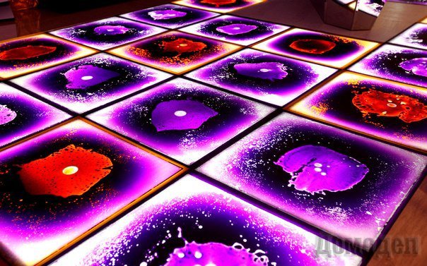 Есть и так называемый «живой» пол. Это пластины из поликарбоната, между которыми заливается специальная жидкость. Такой пол реагирует на каждый ваш шаг, изменяя свой цвет.