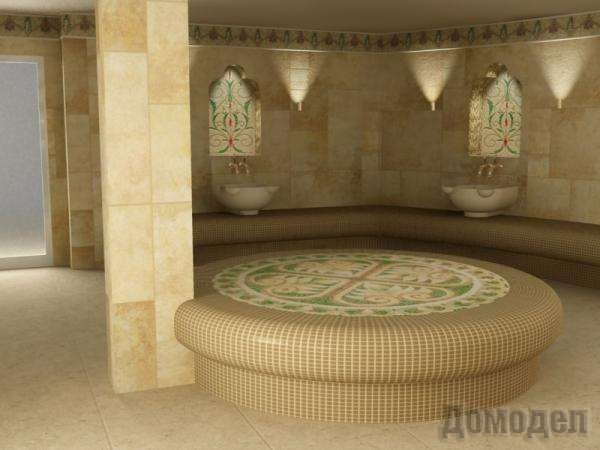 Перед тем, как начать строительство турецкой бани хамама необходимо продумать дизайн. Сложный, замысловатый, он должен воплощать в себе настоящий дух Востока. Пол и стены могут быть выполнены из мрамора или плитки, украшенной мозаикой с разноцветным восточным орнаментом. Они будут отлично сочетаться с расписными нишами, скамеечками и, конечно, потолком, который в традиционных турецких банях является настоящим произведением искусства. Но, пожалуй, ни один хамам невозможно представить без его главного декоративного элемента - курны.