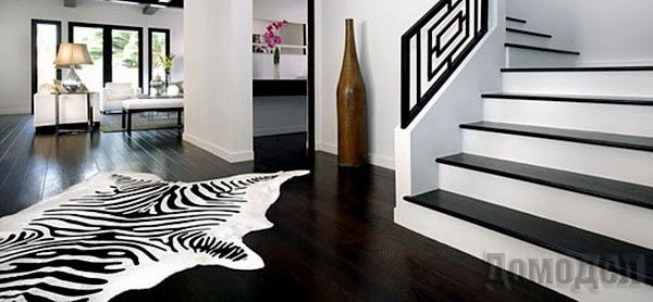 Коврики и комоды, обивка дивана и напольное покрытие с черными и белыми полосами персонализируют обстановку комнаты и подчеркивают тематику дизайна помещения. Обои, шторы, подвесные полки и подушки в черно-белую полоску напоминают пианино и подойдут для творческого, музыкального интерьера.