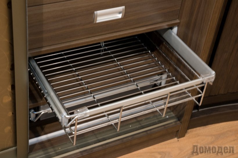 Современные кухонные гарнитуры тоже могут быть оснащены выкатными корзинами. Обычно вся нагрузка ложится на нижних шкафах, точнее, на полках. Здесь располагается вся кухонная посуда. Порой, чтобы достать какую-нибудь посуду, которая находиться в самой глубине нижнего шкафа приходиться отодвигать всю посуду с передней части, что довольно неудобно. С помощью выкатных корзин эта морока очень легко решается.