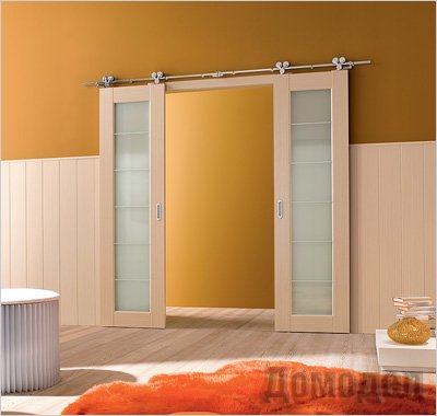 Чаще всего раздвижные двери содержат несколько полотен, однако бывает и одно. В случае очень большого дверного проема придется использовать несколько полотен. При желании раздвижные двери можно дополнить стеклом. Так у вас получится конструкция из комбинированных материалов. Что касается материала изготовления, то он может быть самым различным, будь то ДВП, ДСП, натуральная древесина и пр. Здесь все зависит от ваших личных предпочтение и финансовых возможностей.