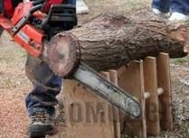 Для начала нужно взять два бруса (4x4 см) длиной 100 см, в них, сложенных вместе боковыми гранями, под углом (угол произвольный, примерно 60) сверлим отверстие диаметром 10 мм.Таких пар брусков нужно не менее двух. После того как все бруски просверлены, в них нужно вставить металлический стержень (10 мм), с резьбой М10 на обоих концах. После этого на стержень нужно надеть деревянные кубики (4x4x4 см), чтобы не ударять пилой по металлу, в конце распиловки.