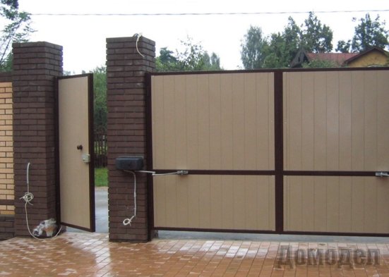 Обычно калитка делается распашной. А вот ворота можно сделать не только распашными, но и раздвижными. Также створки могут откатываться по разным сторонам или открываться в одну сторону или просто подниматься вверх. Если хозяин хочет, чтобы двери быстро и легко открывались, то лучше установить автоматическое устройство для открывания ворот. Очень удобный вариант, ворота сами будут открываться и закрываться.