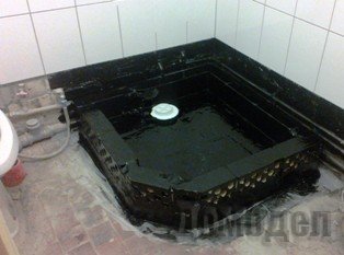 После установки и закрепления гидроизоляционного слоя в поверхности вырезают сливное отверстие и монтируют систему трапа. После устанавливают наклонное напольное покрытие и покрывают его слоем гидроизоляционной смеси.