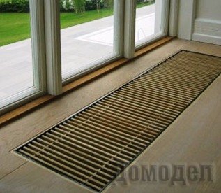 Особенность работы напольного радиатора состоит в циркуляции нагреваемых воздушных потоков. Это позволяет более эффективно обогреть помещение и максимально снизить уровень энергозатрат. Среди минусов напольной отопительной системы можно отметить сложность процесса установки, что влияет на степень ее распространения.