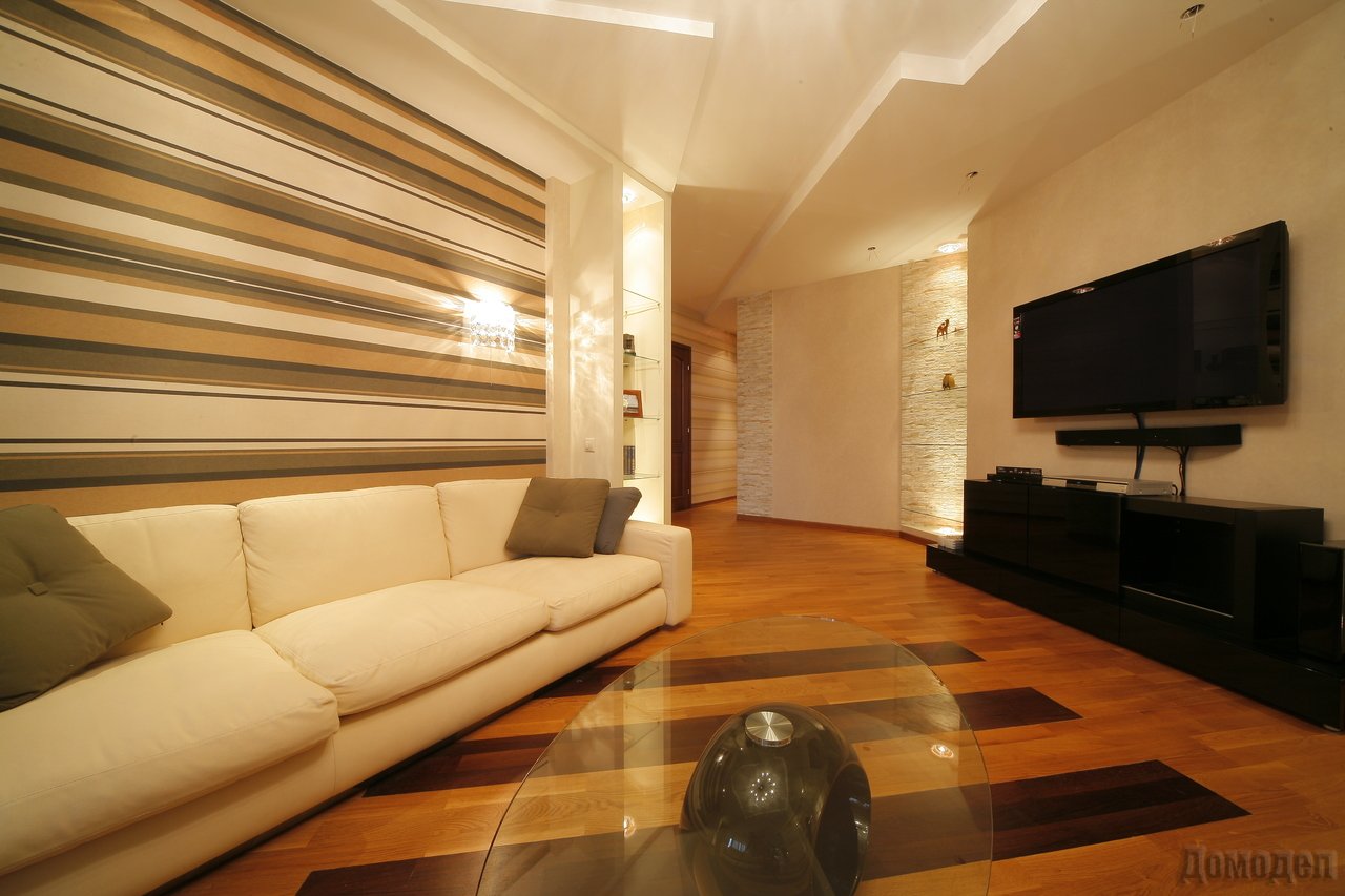 При низком потолке можно использовать такие обои, которые имеют вертикальные полосы. В этом случае потолок немного визуально приподнимается, но размеры помещения от этого начинают казаться меньше. Поэтому использовать данный вариант рекомендуется только в довольно просторных комнатах.