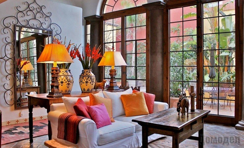 Тканые красочные накидки на стулья, тяжелые портьеры, изделия из керамики различных форм, обильно расставленные по всем комнатам. На стенах размещают гобелены, украшают декоративными тарелками, а также семейными и дружескими фотографиями в разнообразных цветных рамках. Особую изюминку интерьеру придает живая поросль, которой покрывают стены дома как внутри, так и снаружи. На полу хорошо разместить различные коврики в национальных мотивах, а окна и двери украсить железным орнаментом.