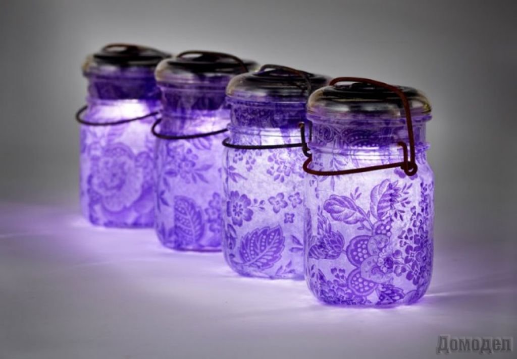 Измеряем диаметр банки и отрезаем от кружева соответствующий кусочек. Далее просто сшиваем его наподобие чехла, оставив незашитыми верхнюю и нижнюю части. То, что у нас получилось, одеваем на банку. Чехол должен плотно прилегать к банке и не спадать с нее. Далее в банку ставим наш светильник и закручиваем крышку. Готово! Если вы выбрали свечу, то лучше взять маленькие свечки с металлической подставкой. При этом не забудьте, что крышку закрывать нельзя (или проделайте в ней отверстие для поступления кислорода).