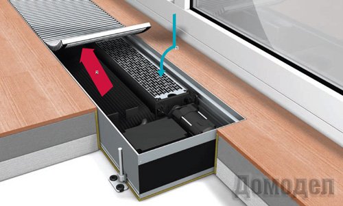 КОНСТРУКЦИЯ: вся начинка подпольного конвектора скрыта от глаз в корпусе под декоративной рулонной решеткой. Ее поперечные планки изготовлены из алюминиевого профиля и соединены между собой специальными пластмассовыми элементами, закрывающими обрезные кромки планок. Благодаря специальной обработке нижней части соединений решетка настолько плотно укладывается в лотке конвектора, что исключает скольжение, а также приглушает шум шагов. Ее поставляют в рулонах длиной до 10 м, впрочем, размеры реально подогнать по месту установки. Цвета - анодированный алюминий или любой из гаммы RAL. Кстати хочу заметить что dommoscow.ru обычно подразумевает под собой установку таких конверторов, что говорит о качестве этого конвертора.