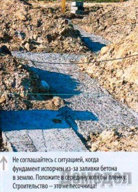 Обеспечить герметичную укладку вертикальной гидроизоляции подушки, забетонированной непосредственно в грунте, практически невозможно. Выходом может стать изоляция из пленки. Ею выстилают котлован до начала бетонирования. Такое решение кажется простым, но, как правило, усложняется на всех углах. При таком способе выполнения фундаментов нельзя также прокладывать пристенный дренаж. Всевозможные проходы инженерных сетей через фундаменты должны быть выполнены до бетонирования или под подушкой. В противном случае - придется пробивать 50-сантиметровую толщу бетона. А это потребует немало усилий.