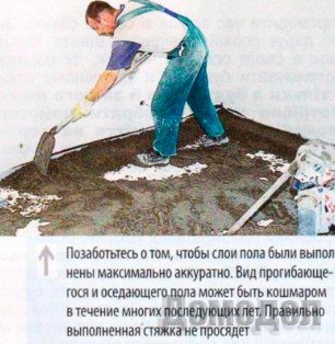 Совет. Нужно особенно аккуратно укладывать слои пола! Пенополистирол, который, как правило, находится под бетонным подкладочным слоем, может деформироваться, а его сжатие зависит от нагрузки. Для пенополистирола марки 25 деформация при нагрузке 100 кПа может составлять 10%. Это значит, что если на фрагменте плиты из пенополистирола площадью 0,1 м2 мы поместим груз весом 1 т, то плита толщиной 10 см сожмется до 9 см. Человек со средним весом вызовет деформацию такой плиты чуть меньше 1 мм. Но если он начнет на ней прыгать, то учитывая динамическое воздействие, деформация будет уже больше 1 мм. Функция стяжки, прижимающей пенополистирол, - равномерное распределение точечных нагрузок. Стяжка выполнит ее успешно, если будет соответствующей толщины и/или правильно армирована. Ошибки при выполнении стяжки наиболее вероятны в углах (например, более тонкая стяжка). Я рискнул бы утверждать, что статический изгиб (без прыжков) более 1,5 мм свидетельствует о подобной ошибке. Вибрация пола уменьшается после размещения предметов обстановки, например, шкафа или стеллажа, то есть после увеличения нагрузки на пол.