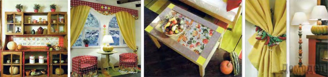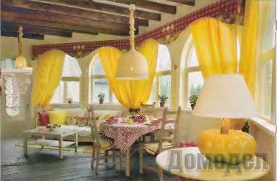 В таком небольшом помещении — 6 окон, расположенных полукругом, и 3 двери. Чтобы завесить окна шторами, мы объединили проёмы попарно карнизами, заготовки которых строители вырезали из ДСП. Мы задрапировали их тканью и украсили жёлтой кафельной плиткой размерами 8x8 см. Для обтяжки карнизов, мебели и декоративных подушек я выбрала ткань в красную клетку, на которой красуются оранжевые тыквы. Жёлтые хлопчатобумажные шторы украсили связками «лука», «перца» и «чеснока».