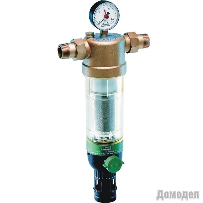 Необходимость промывки контролируют визуально че-оез прозрачные стенки пластиковой чаши или с помощью манометра, показания которого скачкообразно уменьшаются при разборе воды. По величине перепада судят о фильтрующей способности — если падение давления больше 0,5 атм, сетку пора промывать. Именно так определяют потребность в обслуживании «непрозрачного» фильтра для горячей воды (с последней буквой «М» в обозначении) с колбой из красной бронзы.