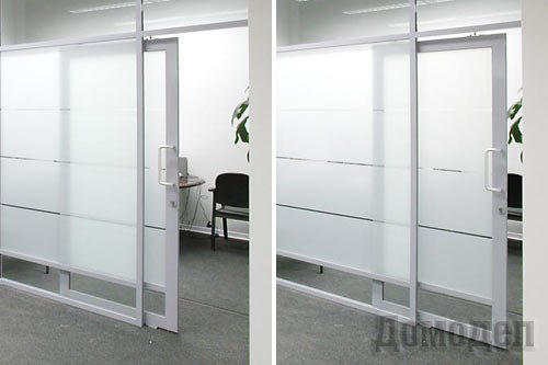 На стекло можно наклеить специальную, обладающую зеркальным эффектом пленку, имитирующую жалюзи или витраж, или матовую разных оттенков. По желанию отдельные участки пленки вырежут и удалят, получая оригинальный рисунок. В более дорогом варианте вставят рифленое архитектурное, обработанное пескоструйным методом, или травленое стекло.