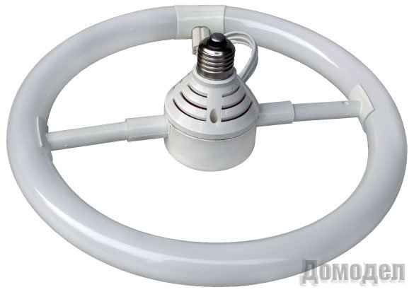 Подобную проблему с успехом решает люминесцентная лампа-руль. Она действительно похожа на руль, плоская и прекрасно подходит для больших потолочньк светильников, абажуров, торшеров с одним патроном Е27 и заменяет лампу накаливания мощностью до 270 ватт.