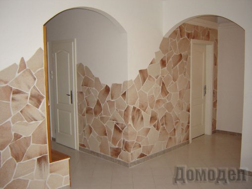 Отделка из такого камня выглядит прекрасно и необычно – получается текстура камня, при этом сам процесс отделки стены в разы легче и быстрее, сопоставимо с клейкой обычных обоев по сложности.