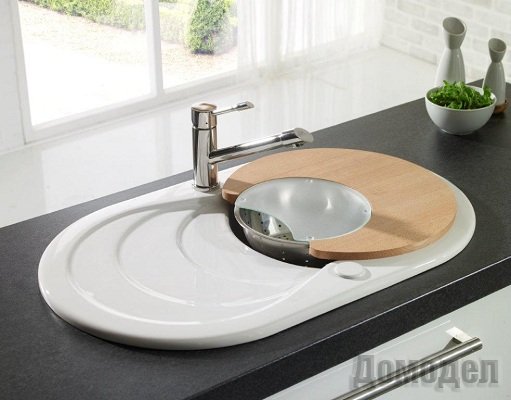 С такими мойками удобно использовать специальные приспособления такие как: разделочные доски, дуршлаги и т.п.