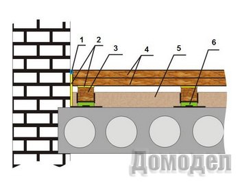 2. Сухая стяжка. Одним из самых простых вариантов этой модели плавающего пола является «слоеный пирог», при создании которого последовательно чередуются засыпка из песка или керамзитовой крошки, 2 слоя влагостойких гипсоволоконных плит, кромочный изоляционный материал (пенополиэтилен или минеральная вата). Такой вариант оказывается сравнительно небольшим по толщине, что позволяет его использовать в помещениях с низким потолком.