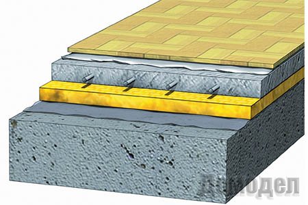 3. Бетонный плавающий пол. Такую конструкцию используют в помещениях, в которых требуется высокая прочность полового покрытия - в гаражах, на складах. Изоляционный материал укладывают на бетонное основание. При необходимости используют и гидроизоляционные материалы. По контуру стен выполняют закрепление кромочной изоляционной ленты. Затем формируют бетонную стяжку, которую армируют при помощи металлической сетки.
