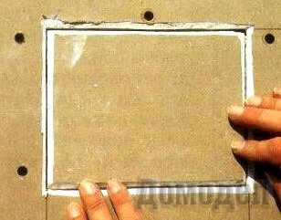 - По контуру, который появился на стене, вырезаем отверстие. Делать нужно все аккуратно, для того чтобы диаметр отверстия не увеличился иначе заплатка не подойдет.