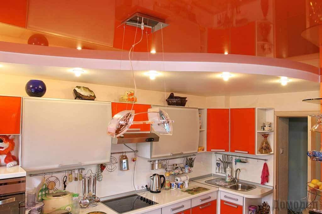 Натяжной потолок располагают на небольшом расстоянии от потолка, чтобы под ним можно было скрыть все коммуникации, но это, в свою очередь, немного уменьшает высоту помещения. Он выполняется из пленки ПВХ или тонкого полотна. Поливинилхлоридная пленка имеет хорошую водонепроницаемость, но слишком легко рвется при малейшем механическом воздействии. Такой потолочное покрытие предварительно сваривается из нескольких полосок пленки и вырезается по размеру потолка. А вот бесшовные потолки гораздо прочнее, но пропускают воду.