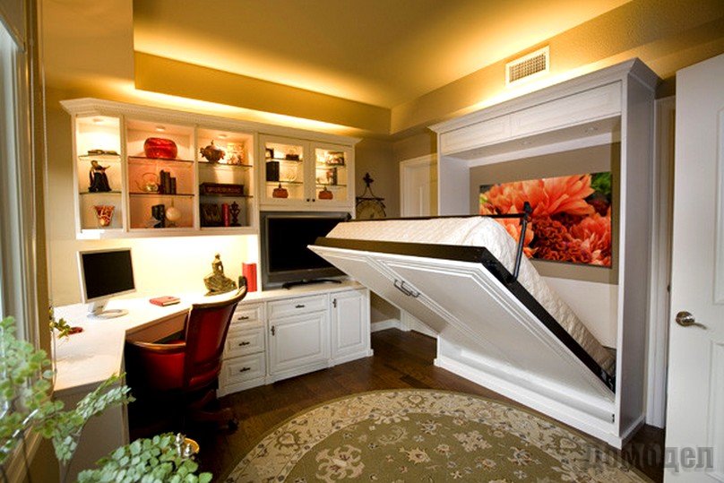 Можно выбрать и современную мебель-трансформер, где, например, два пуфа могут в сложенном виде служить столом. Это будет очень удобный вариант для однокомнатной квартиры. Если же хозяева желают спать только на полноценной кровати, она может складываться к стене. В роли стола удобно использовать небольшой журнальный столик на роликах. Что касается стола для работы, стоит присмотреть раскладной стол, который пригодится и во время праздничных застолий.