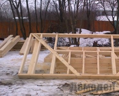 Монтаж начинают с установки потолочных перекрытий. Чтобы крыша была прочной и не прогнулась из-за повышенной нагрузки, выбирают достаточно толстые бруски. Их укладывают на бревна верхней обвязки и закрепляют гвоздями.