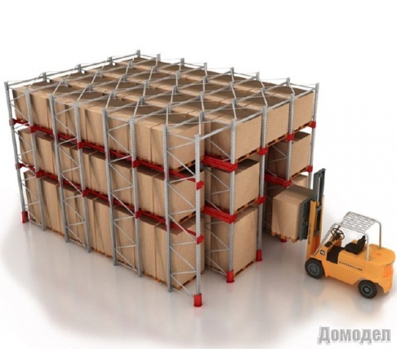 • Стеллажи для любого размера поддонов. Такая конструкция самая обычная в эксплуатации, её используют для тяжёлых грузов, которые запакованы в паллеты. Утрамбовывать такие стеллажи можно практически любой техникой.