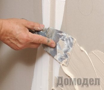 Большим преимуществом данного состава можно назвать то, что его удается наносить прослойкой с минимальной толщиной – всего 2–5 мм. В описываемом случае применяется мелкозернистая или так называемая финишная шпатлевка. Состав наносится поверх штукатурки широким шпателем, после чего разглаживается правилом.