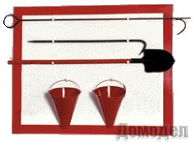 - пожарный щит – он размещается на стене, для закрепления на нем противопожарных инструментов, таких как, багра, лопата, лом, топор и ведро;