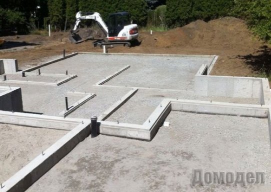 Еще одним видом экономной основы для дома является ленточный малозаглубленный фундамент. В начале его строительства необходимо вырыть ров глубиной 500 мм и уложить песочную насыпь около 200-300 мм высотой. Чтобы поднять будущий фундамент над землей, необходимо соорудить опалубку, после чего установить арматурный каркас и залить его бетоном. Также, при возможности, для экономии финансов опалубку можно взять в аренду. Представленный вариант строительства МЗФ считается самым простым, но кроме него есть и намного сложнее схемы постройки. Использовать такой фундамент можно для установки таких сооружений как баня, гараж, а также строительстве загородных домов, предназначенных для постоянного проживания.