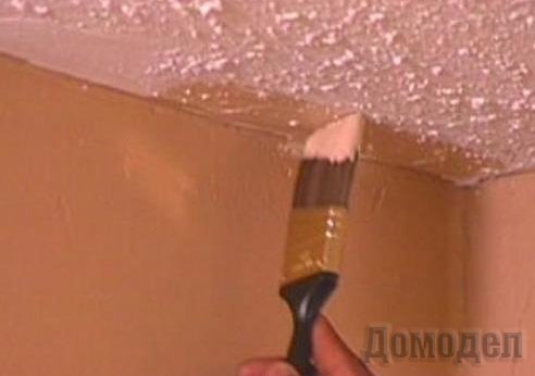 Перед покраской потолок следует выровнять. Обязательно прогрунтовать, для этого лучше взять универсальную акриловую грунтовку. Затем грунтовку следует высушить.