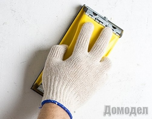 Далее следует стену прошпаклевать. Шпаклевать стены нужно финишной шпаклевкой, она имеет более мелкозернистую структуру, чем стартовая, что позволит добиться идеально гладкой поверхности. Когда шпаклевка высохла, ее нужно загладить. Для этого нужно воспользоваться специальными терками с сеточкой. Однако чтобы добиться отличного результата, зашкуривать шпаклевку следует очень аккуратно, не прибегая к слишком жесткой сетке. Можно воспользоваться наждачной бумагой с зерном в размере 120-150, она позволяет меньше царапать шпаклевку.
