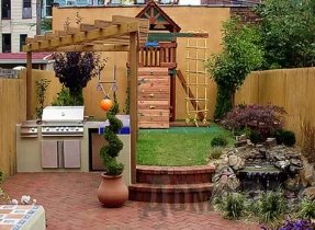 - Зона отдыха – беседки из легких тканей которую можно заказать тут http://utk18.ru/, мангал, детская площадка;