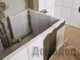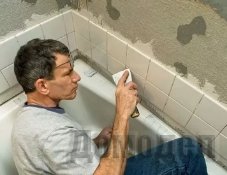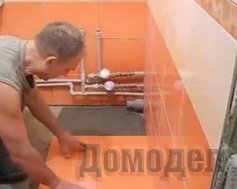 Облицовку ванны начинают с крепления рейки опоры на расстоянии высоты кафеля от пола. У стены нужно определить середину и с этого места начинать работу. Замешать строительным миксером в ведре раствор клея, нанести его на кафель зубчатым шпателем и приставить в определённое место. Положив следующий кафель, установить крестик для необходимого размера шва. Применяя уровень выложить ряд, каждый раз простукивая резиновым молотком для плотности.