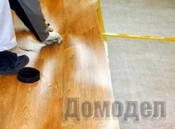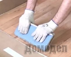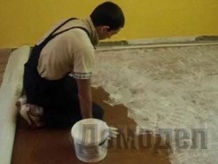 После этого половина с клеем прижимается к полу и разглаживается валиком. Ту же операцию проводим со второй половиной настила, при этом отогнуть ее надо до линии, на которой покажется клей. Важно использовать именно тот клей, который рекомендован для той или иной разновидности покрытия.