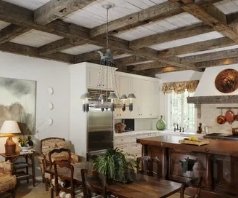 Если вы решите выбрать этот оригинальный дизайн для своей дачи, вам нужно будет подумать о приобретении декоративных балок. В прованском стиле – это один из обязательных элементов украшения потолка. В настоящее время для их изготовления применяются самые разные материалы – дерево, ДСП, МФП, полиуретан, клееный массив и т.д.