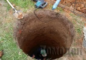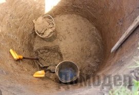 Поняв, что шахтный колодец – именно то, чего вы хотели, можете приступить к раскопке. В одиночку с такой работой не справится, потребуется второй человек. Один будет внизу, копать яму длиной от половины до метра, второй сверху, принимать ведро с землей, переданное ему с помощью простейшего устройства – лебедки, и высыпать его на поверхность. Диаметр выкопанной ямы должен совпадать с заранее выбранными бетонными кольцами. Оптимальным размером для самостоятельной установки колодца считается 1,1 метр.
