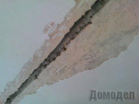 Затем из нее вырезаются куски, по размеру чуть больше чем имеющаяся трещина на потолке. Эти куски смачиваются в клее, отжимаются и накладываются на трещину. Теперь остается ее аккуратно выровнять, расправить, дать возможность высохнуть, а затем зашпаклевать.