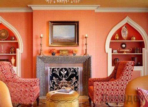 Интонация Востока в дизайне гостиной даёт ей живость и грациозность. Интерьер в амбровом стиле крепко соединяется с истомной атмосферой абсолютной неги и полной тишины и спокойствия. Привлекает своей помпезностью, множеством подушек и ковров, ярких тонов и золота, живописными арками и стрельчатыми окнами.