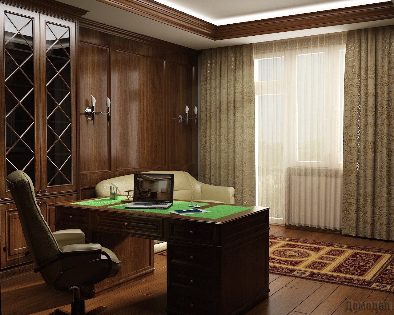 Сначала определитесь, с функциями, которые будет выполнять кабинет, и какая мебель и оргтехника вам необходима. Солидный человек, как правило, выбирает кабинет в классическом стиле. Потолок и пол обшивают натуральным деревом. В нём из ценных пород дерева сделана мебель и украшена бронзой. Обычно она солидная и массивная.