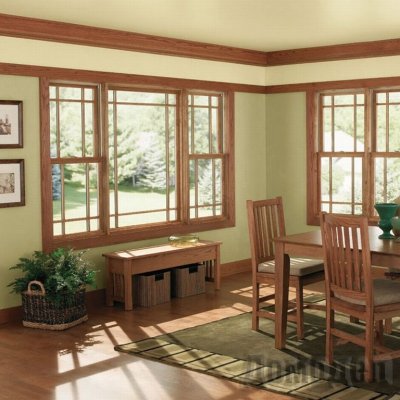 Даже двуцветную отделку, когда окно внутри дома одного цвета, а снаружи, со стороны улицы, другого. Кстати, пластиковые окна таким разнообразием не блещут. Зато они дешевле.