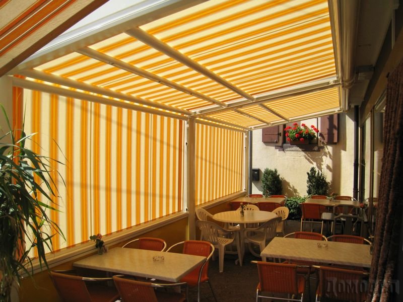 Так markiflex.com.ua могут крепиться к пристенной или отдельно стоящей раме, при этом выполняя над террасой функцию тканевой раздвижной крыши.