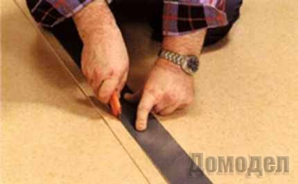 Уложенный лист линолеума сразу подгонять под требуемые размеры не рекомендуется, следует дать ему вылежаться, чтоб впоследствии не возникало вспучиваний из-за возможного перепада температуры. По прошествии нескольких часов, можно начинать обрезку краев, оставляя зазоры около одного сантиметра.