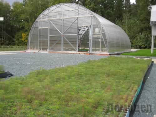 Из брусков сооружается каркас крыши. Затем, он покрывается пленкой, которую необходимо закрепить с помощью пластиковых бутылок. Двери делаются из таких же брусков и тоже покрываются пленкой. Теплица готова.