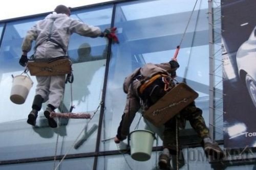 Высотное мытье окон при помощи альпинистов-профессионалов